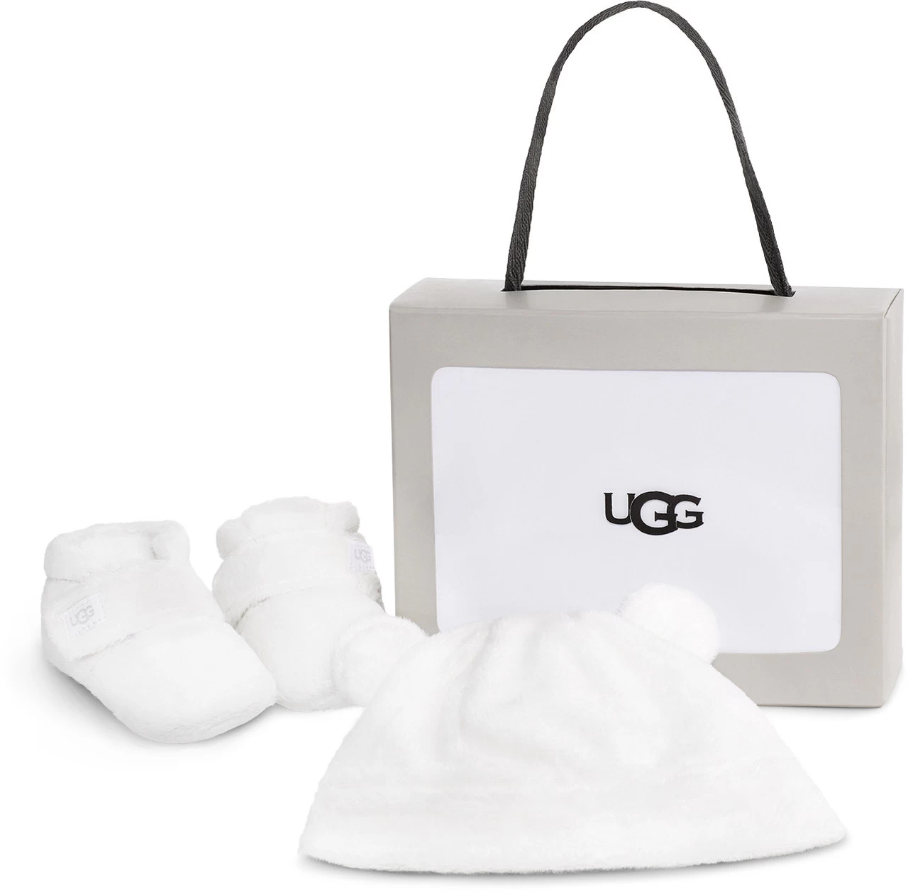 Englin’s Fine Footwear presents the infant’s ‘Bixbee and Beanie’ from UGG. This snug combination features our customer-favorite Bixbee and an adorable matching teddy bear beanie to keep your baby cozy from head to toe. Featuring an easy hook-and-loop closure, the machine-washable bootie wraps the littlest of feet in soft fleece with slip-resistant rubber print to assist their first steps, while the beanie is just plain cute.