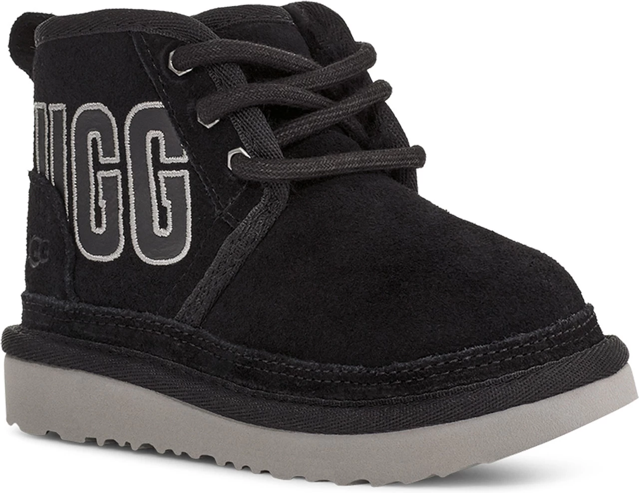 Englin’s Fine Footwear presents the children’s ‘Toddlers Neumel Graphic Outline’ from UGG. Updated with easy zip entry and an oversized UGG graphic, the best-selling Neumel features ultra-soft UGGplushâ„¢ lining to keep your little one cozy. This chukka is built to move the way kids do with a rocker-bottom shape and the super-lightweight outsole for traction and durability. Pair with the matching men’s boot for cute mini-me photo ops.